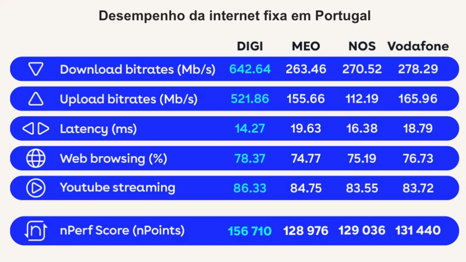 Apesar de todas as dificuldades que a operadora romena enfrenta em Portugal, a verdade é que a qualidade da fibra tem superado os seus concorrentes. Segundo a avaliação feita pelo barómetro anual nPerf Speed Test, a DIGI lidera o setor.