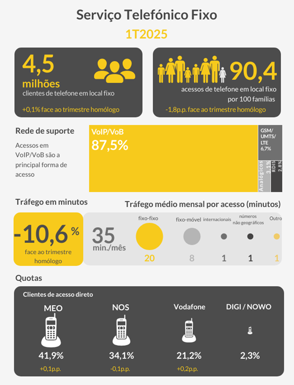 No 1.º trimestre de 2025 foram consumidos, em média, por mês, 35 minutos por acesso, dos quais 20 minutos em chamadas fixo-fixo, 8 minutos em chamadas fixo-móvel e 1 minuto em chamadas internacionais.