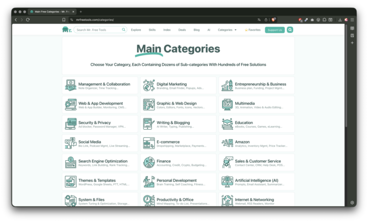 A plataforma organiza as mais de 1900 ferramentas gratuitas em 24 categorias e mais de 600 subcategorias, com um sistema de pesquisa avançado e filtros, para entregar soluções gratuitas ou versões freemium de forma rápida.