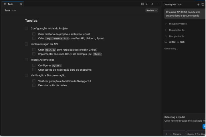 E o agente faz o trabalho de uma ponta à outra: escreve o código, testa, corrige erros e apresenta resultados.
