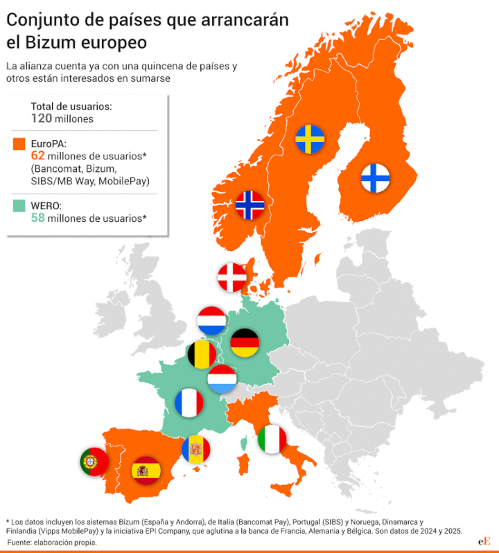 O sistema Wero, da EPI Company, começou com os bancos da Alemanha, França e Bélgica, e, no próximo ano, integrará o sistema financeiro do Luxemburgo e dos Países Baixos. Algumas entidades da Áustria deram, também, passos com o Wero, segundo o jornal espanhol.