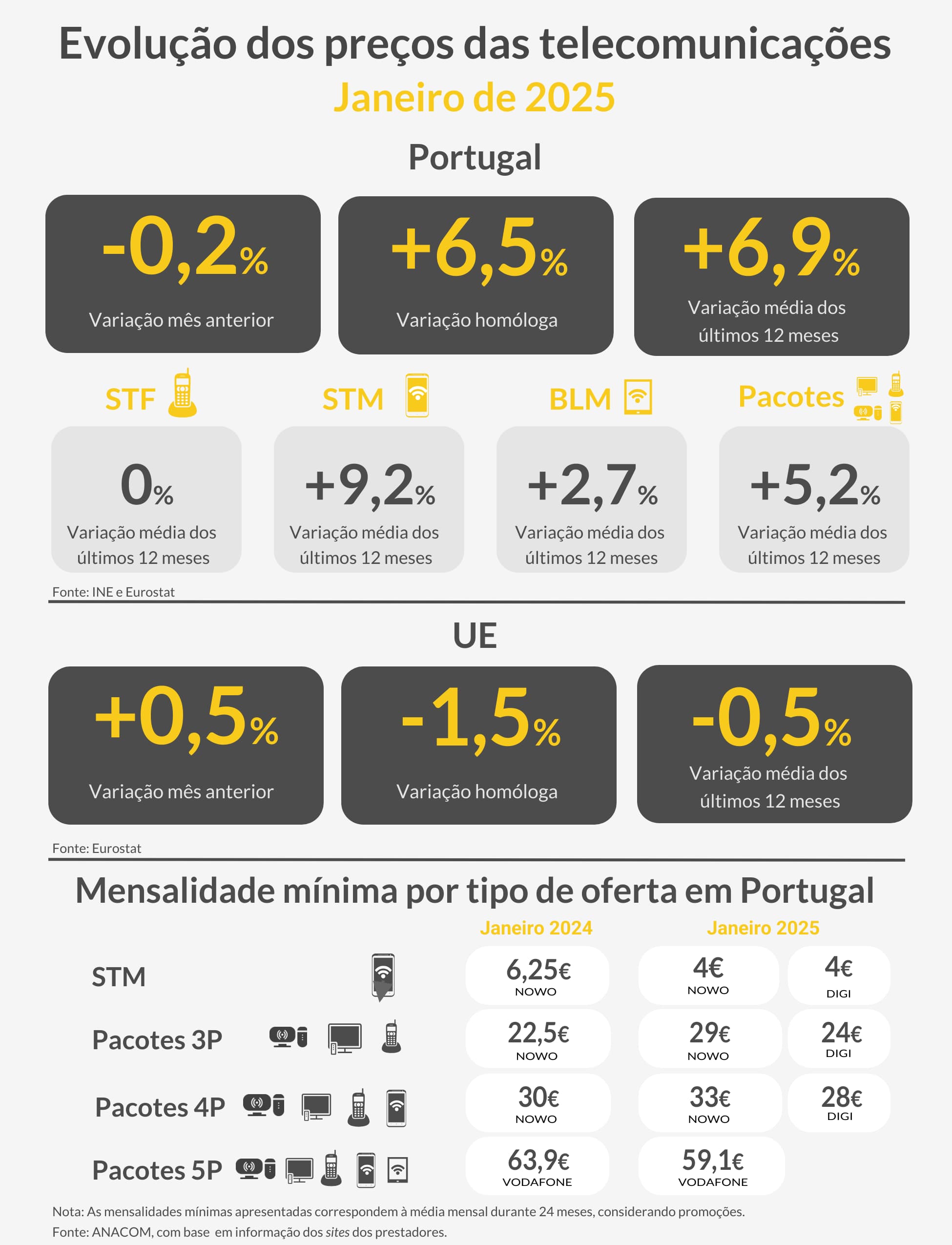 Em janeiro de 2025, os preços das telecomunicações, medidos através do respetivo grupo do Índice de Preços do Consumidor (IPC) Link externo., diminuíram 0,2% face ao mês anterior em resultado de alterações ocorridas em ofertas em pacote.