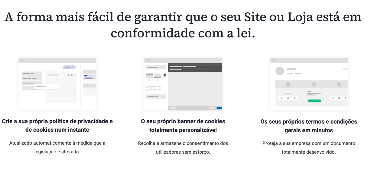 Tudo isto com atualização contínua conforme a legislação evolui. O processo é simples: insere o domínio a analisar, instala o script fornecido no seu site (como se fosse o Google Analytics) e recebe um relatório com os passos a seguir. Não é preciso conhecimento legal — a plataforma guia-o em todo o processo.