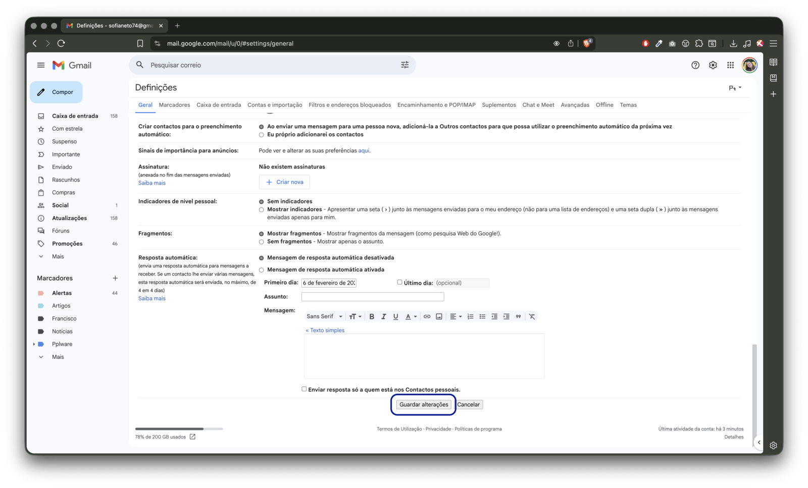 - Clique nas Definições, no canto superior direito da caixa de e-mail;