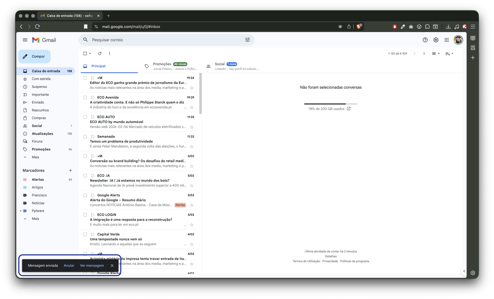 Desta forma, assim que enviar os próximos e-mails, a opção para desfazer o envio aparecerá, no canto inferior esquerdo, durante mais tempo.