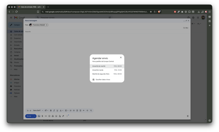 - Em vez de clicar no botão Enviar, quando está a escrever um e-mail, clique na seta logo ao lado;