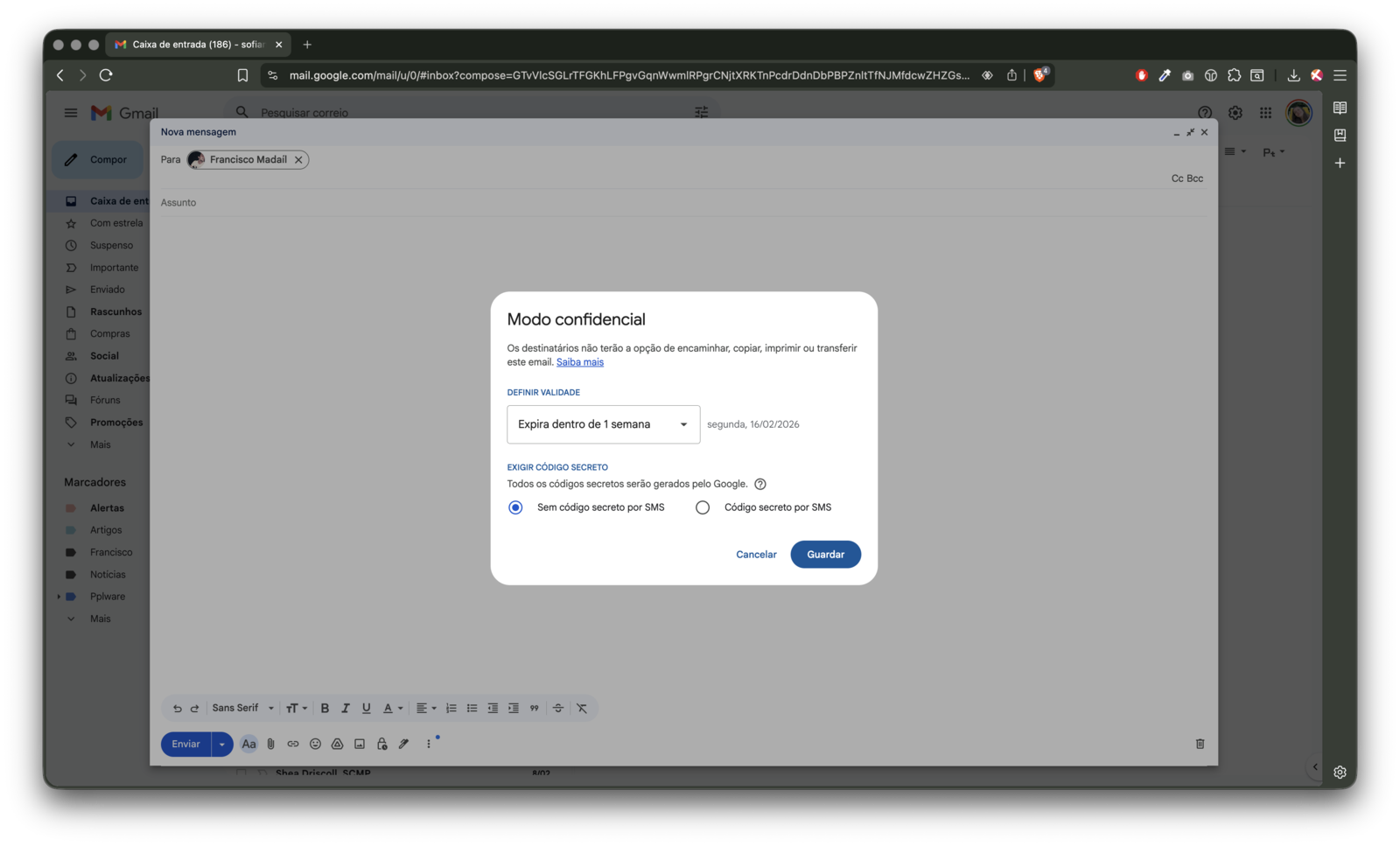- Defina se o destinatário precisa de receber um código secreto por SMS para abrir o e-mail, e defina a data em que o e-mail vai expirar, depois de enviado.