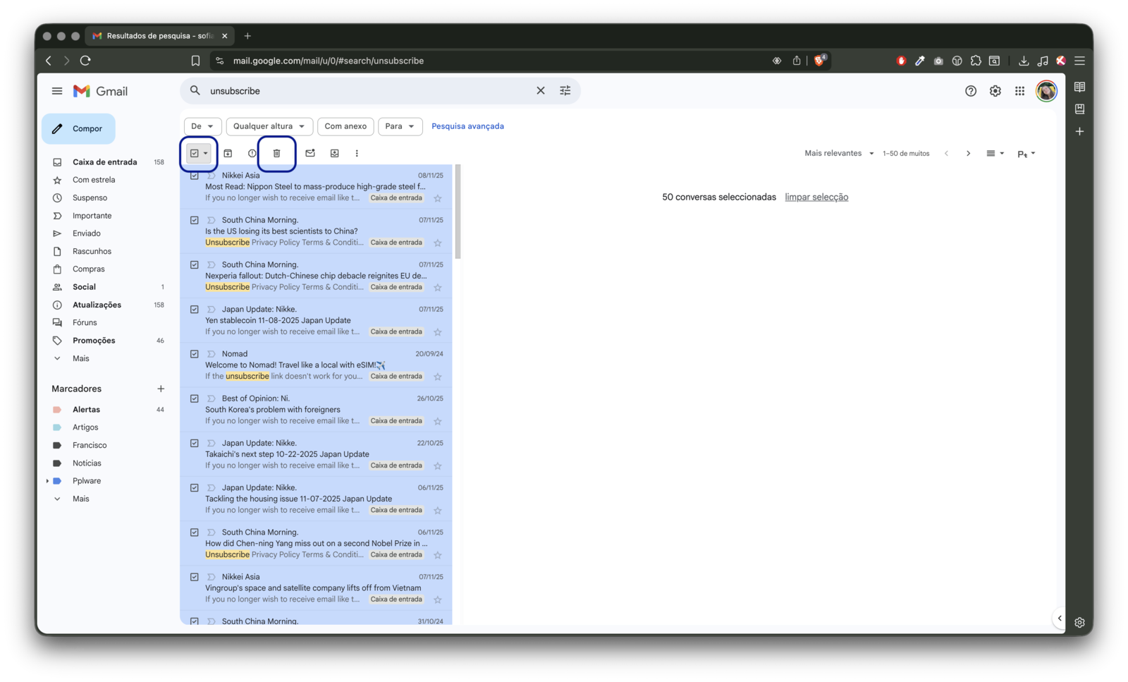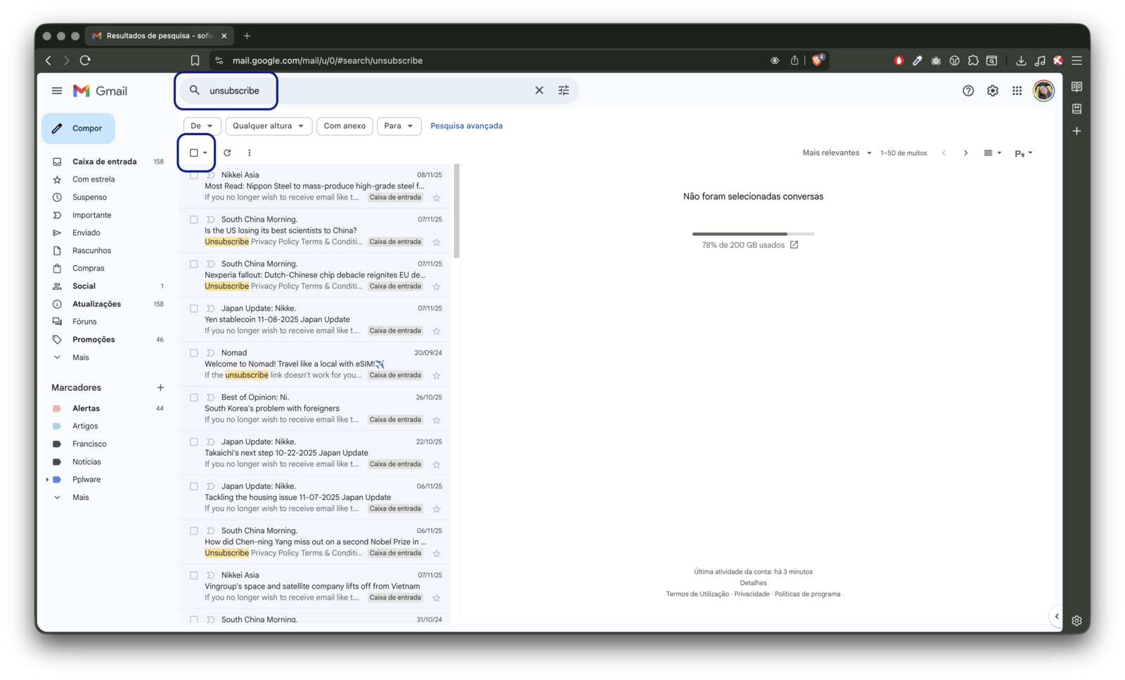 - Digite unsubscribe no campo de pesquisa, em cima, por forma a que o Gmail mostre todos os e-mails de publicidade e newsletters;