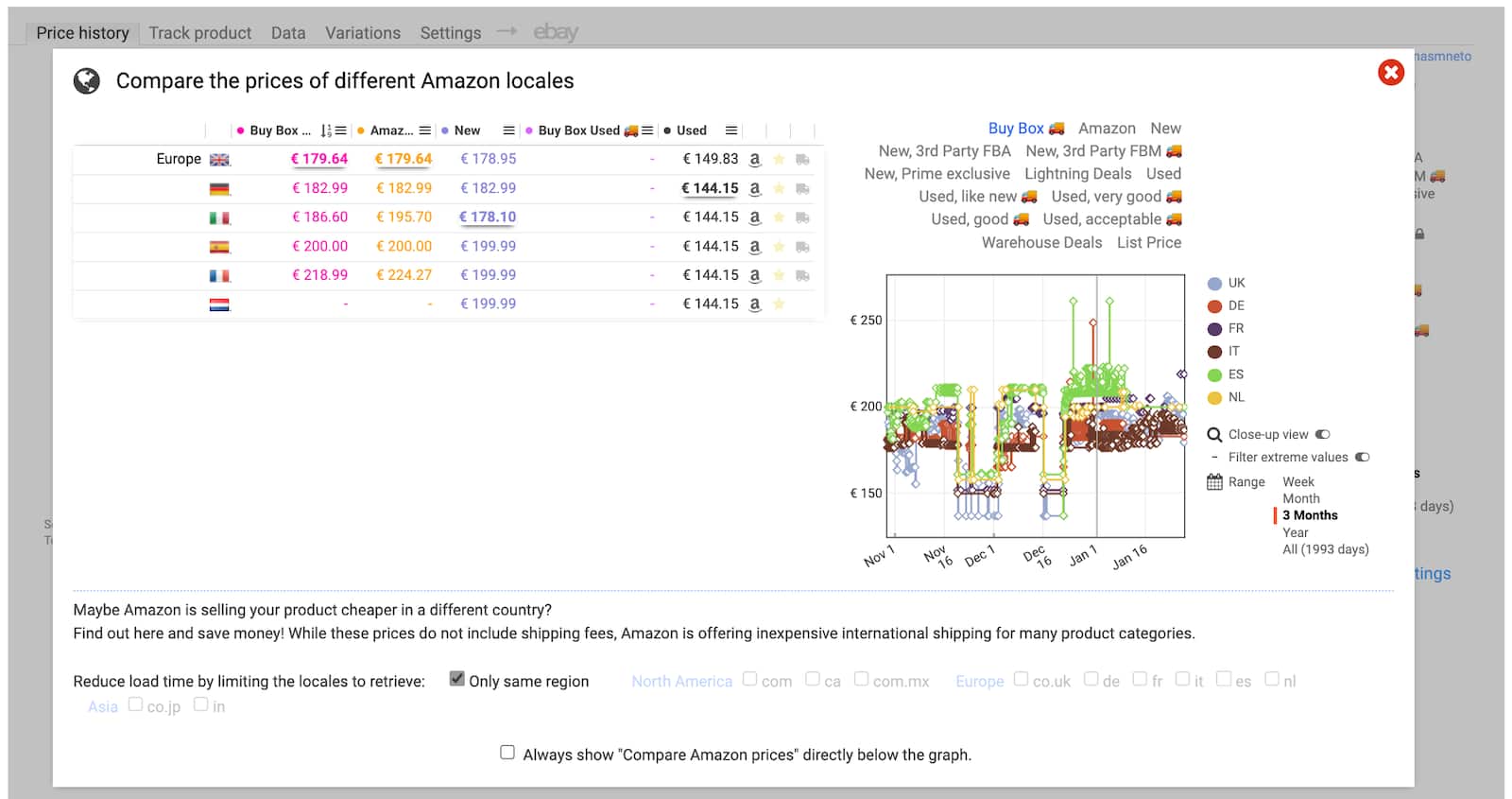 A ferramenta permite comparar preços noutras lojas da Amazon, incluindo os principais países e regiões, clicando em Compare international Amazon prices, no separador Price history.
