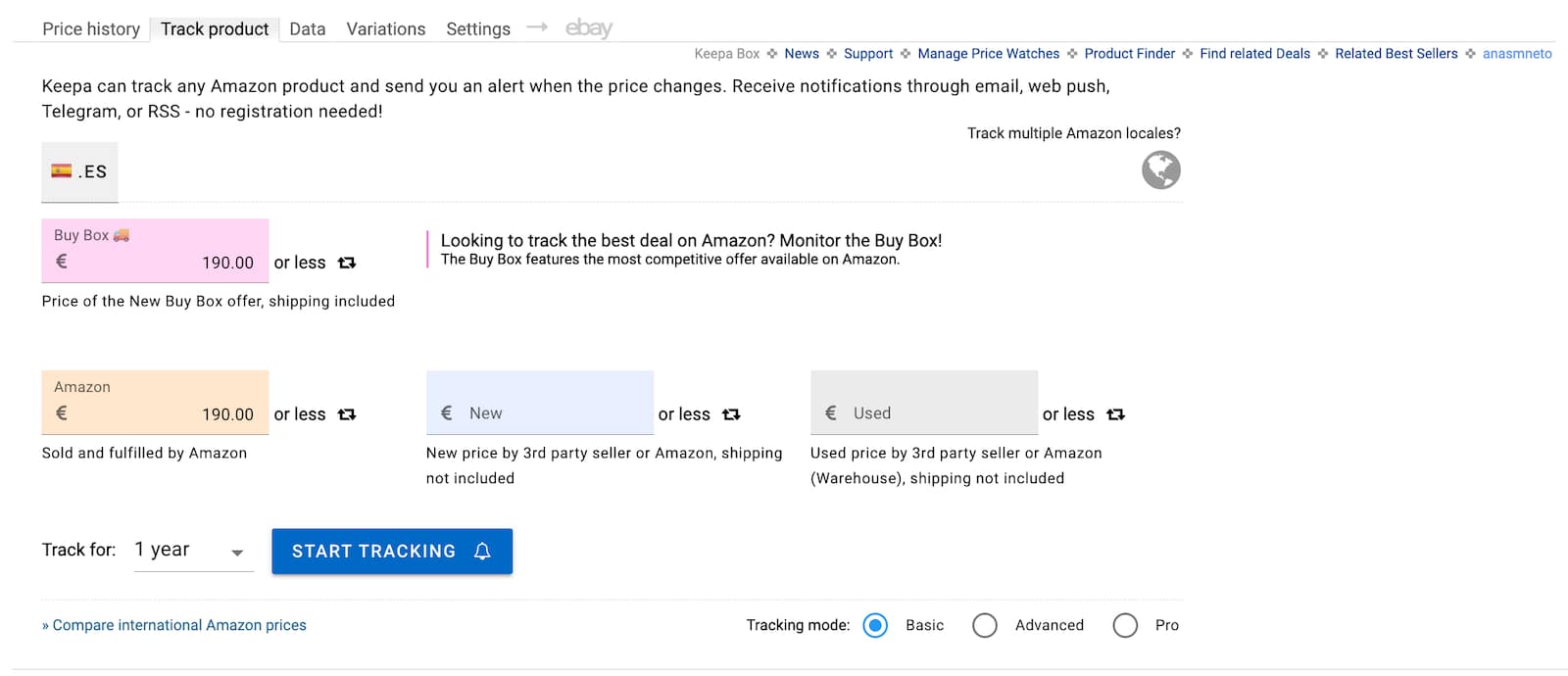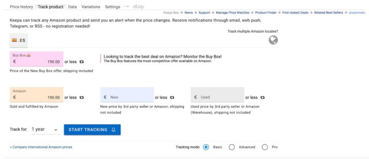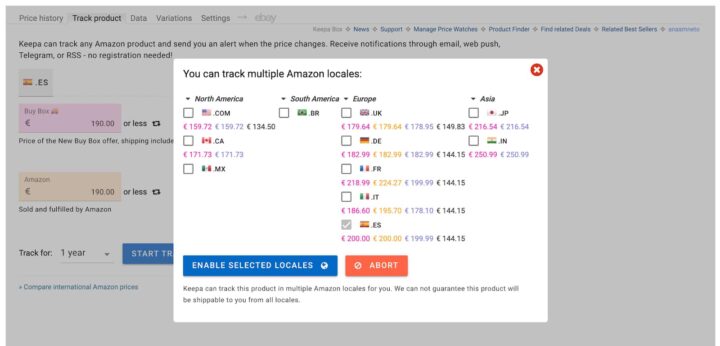 A extensão permite ativar notificações para quando o valor ficar abaixo de um patamar definido ou para quando o produto voltar a estar em stock, no separador Track Product. Para tracking noutras lojas da Amazon, basta aceder a Track multiple Amazon locales, no canto superior direito do gráfico.