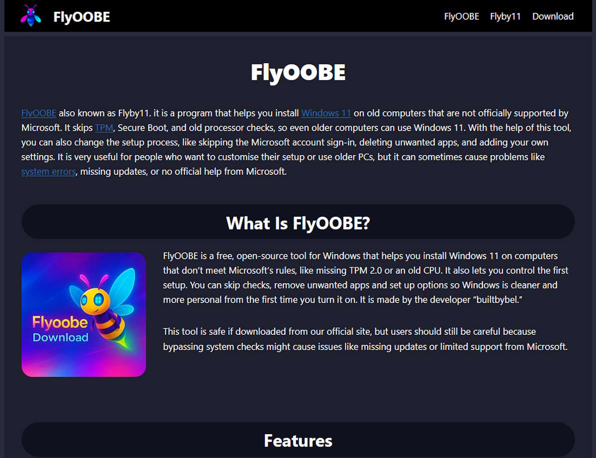 Além disso, este software pode conter scripts ocultos concebidos para roubar dados pessoais. Originalmente conhecido como Flyby11, o Flyoobe utiliza o slogan "Uma melhor forma de instalar o Windows". A ferramenta pretende tornar o Windows 11 mais acessível, especialmente em computadores mais antigos ou com configurações mais modestas.