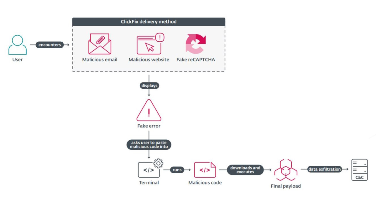 Fluxo simplificado do ataque ClickFix. Crédito: Threat Report - H1 2025, ESET