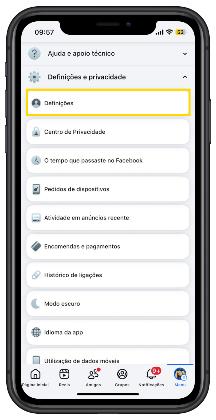 - Descer até Definições e privacidade;