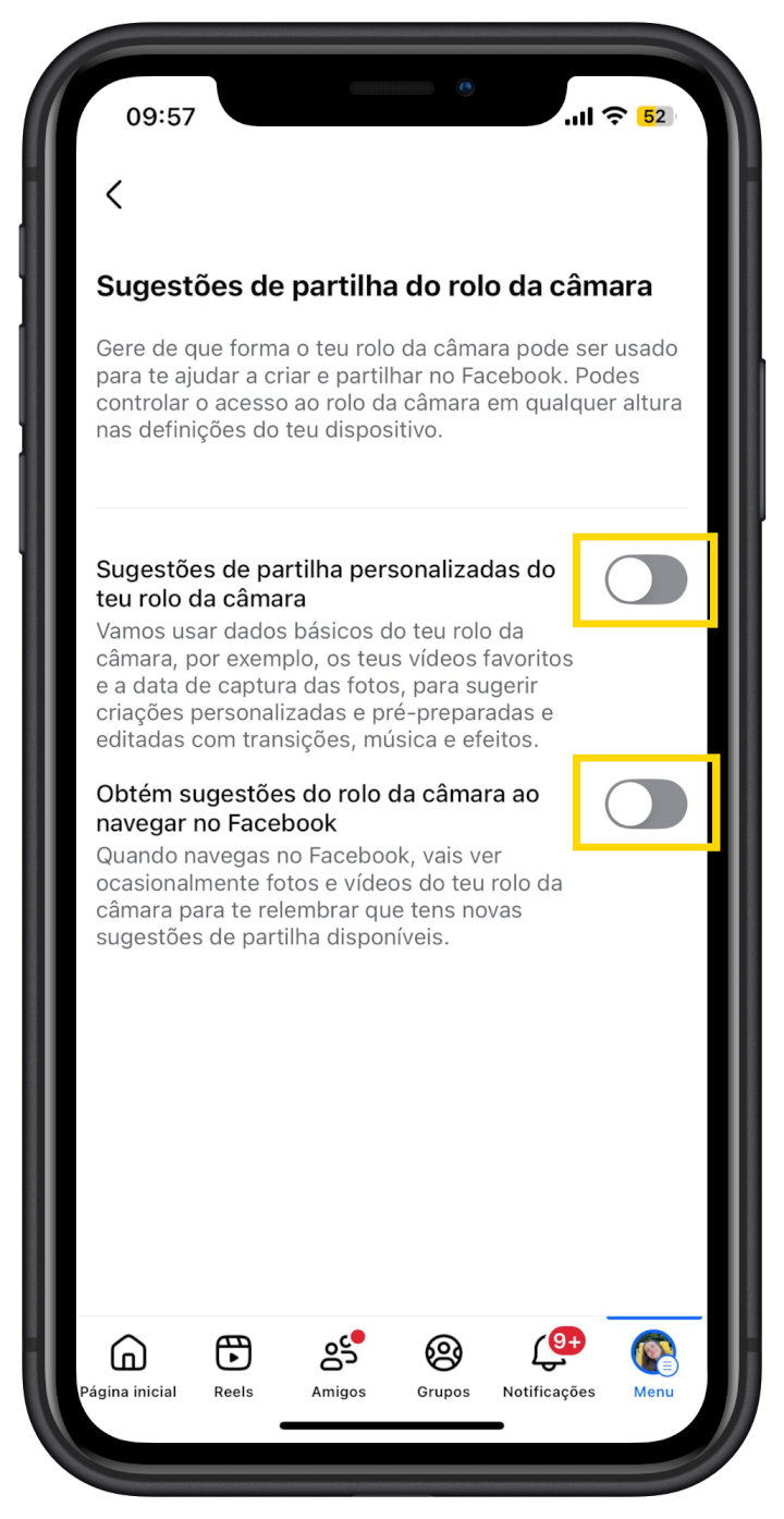 Apesar de o tutorial acima ter sido feito num iPhone 12, o processo deverá ser semelhante nos modelos Android. Num Samsung, por exemplo, basta entrar na app do Facebook, aceder ao ícone do perfil, no canto superior direito, clicar no ícone das Definições, no canto superior direito, descer até Sugestões de partilha do rolo da câmara, e ativar ou desativar os botões.