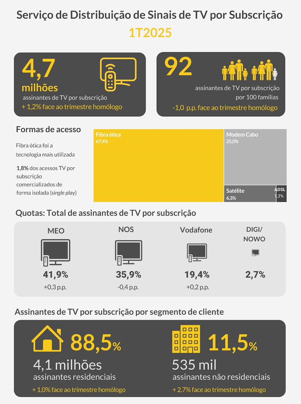 Os assinantes residenciais, que representavam 88,5% do total de assinantes, foram os que contribuíram para esta evolução. No final do 1.º trimestre de 2025, existiam 4,1 milhões assinantes residenciais do serviço de distribuição de TV por subscrição, mais 39 mil (+1,0%) que no trimestre homólogo, e menos 4 mil (-0,1%) que no trimestre anterior. No segmento não residencial o número de assinantes totalizou 535 mil, representando 11,5% do total de assinantes, e registou um crescimento de 2,7% face ao trimestre homólogo.