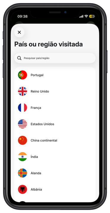 - Deslizar até ao fundo da lista de países e clicar no país adicionado;