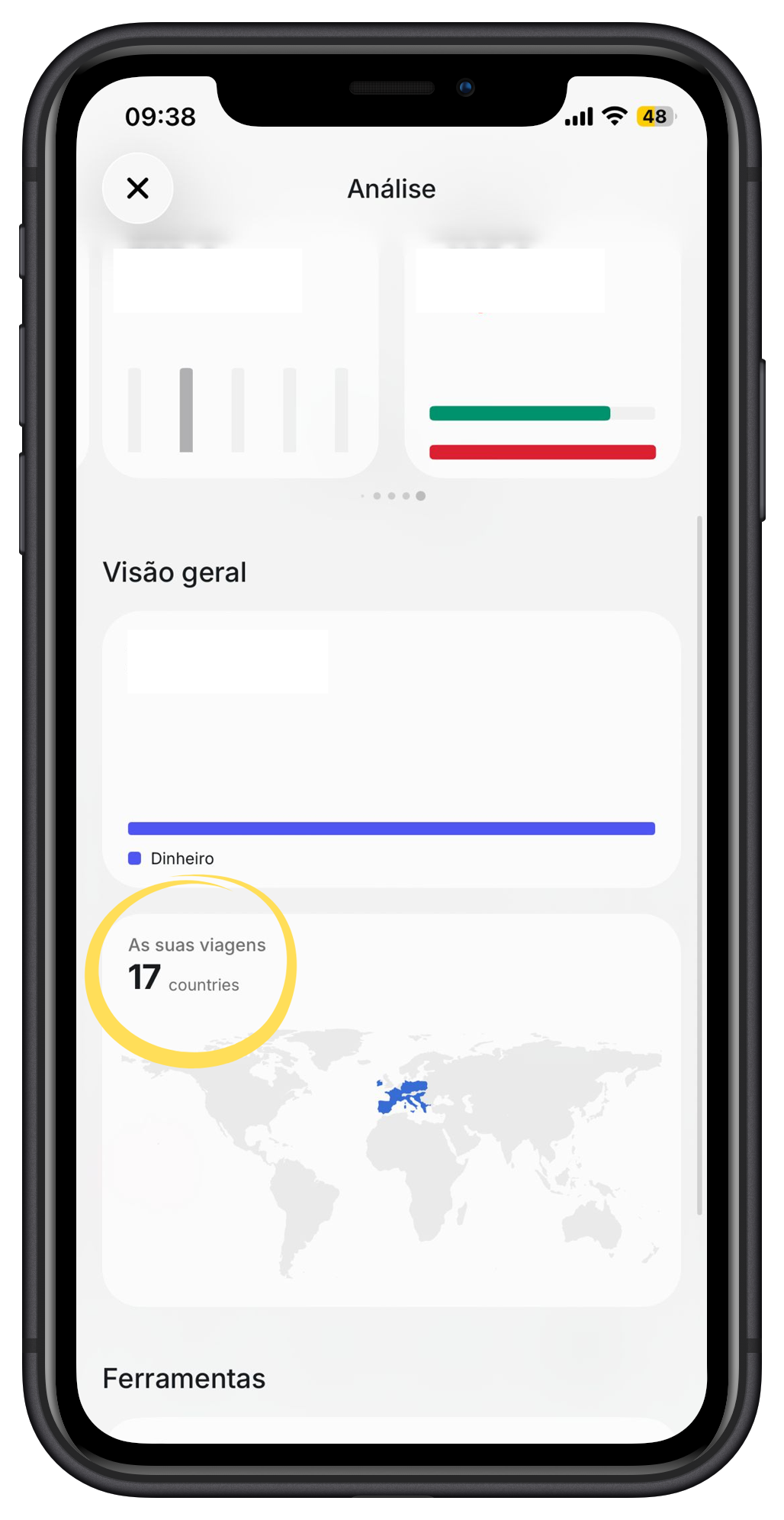 A partir das transações feitas no estrangeiro, a Revolut identifica os países visitados e apresenta essa informação de forma visual, permitindo perceber rapidamente por onde já andámos.