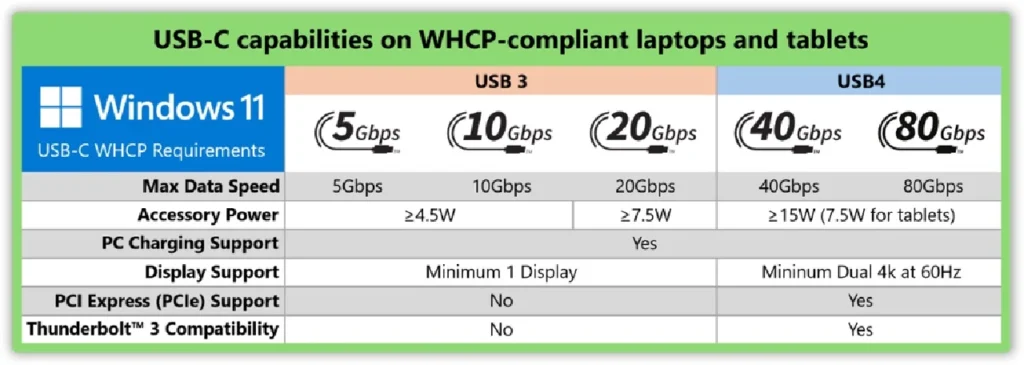 Para resolver o dilema do USB-C, a Microsoft reforçou o seu Programa de Compatibilidade de Hardware do Windows (WHCP). A ideia é estabelecer requisitos mínimos obrigatórios para as portas USB-C em PCs com Windows 11. Os fabricantes que cumpram os critérios WHCP serão obrigados a incluir portas USB-C capazes de carregar a bateria do computador, transferir dados e exibir num monitor externo através do DisplayPort Alt-Mode. Isto independentemente da velocidade das portas USB-C da máquina.