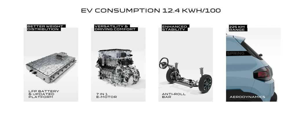 - A secção central da plataforma foi reforçada para receber uma nova bateria de lítio-ferro-fosfato de 24,3 kWh, com tecnologia cell-to-pack, tornando a carroçaria mais rígida e equilibrando melhor o peso entre dianteira e traseira.
