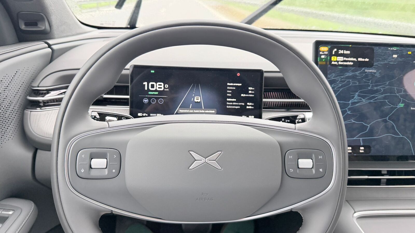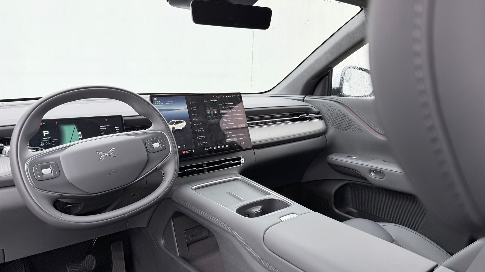 O volante do Xpeng G6 concentra os principais comandos da condução, permitindo gerir funções sem retirar os olhos da estrada. À esquerda estão os sistemas de assistência, como o cruise control adaptativo e a manutenção na faixa. À direita surgem os controlos multimédia, navegação no painel digital e comando por voz. Destaca-se ainda o botão de atalho configurável, que pode ser personalizado no ecrã central para acesso rápido a um modo de condução, a uma função específica ou a um menu utilizado com frequência.