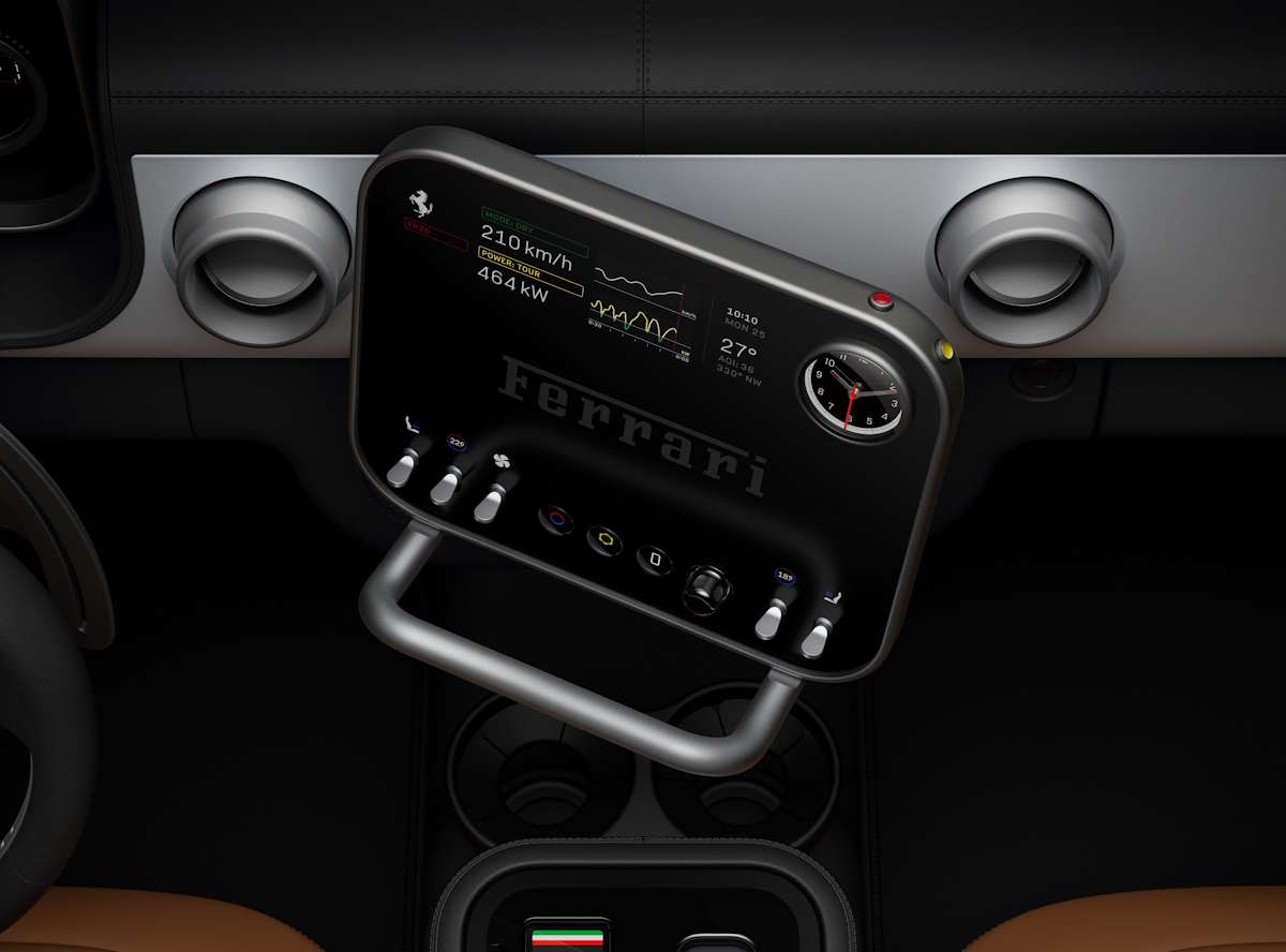 À esquerda, um segundo ecrã indica o modo de condução, que o condutor pode alterar em tempo real (o e-Manettino). O ecrã à direita exibe até sete informações (bateria, pressão dos pneus, estado do veículo, etc.) que o condutor seleciona através de uma alavanca mecânica.