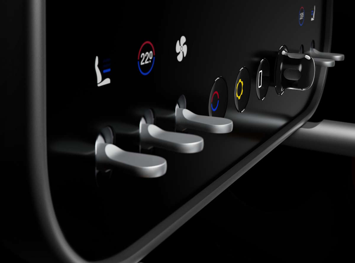 De cada lado do volante, encontram-se dois módulos de controlo analógicos. Os limpa-para-brisas são operados por um pequeno botão rotativo com uma lente de aumento que amplia a definição selecionada. Na verdade, são quatro painéis OLED (fornecidos pela Samsung). Atrás do ecrã, está o painel de instrumentos, que exibe com destaque o velocímetro e o nível da bateria — também um ecrã circular com várias animações subtis.