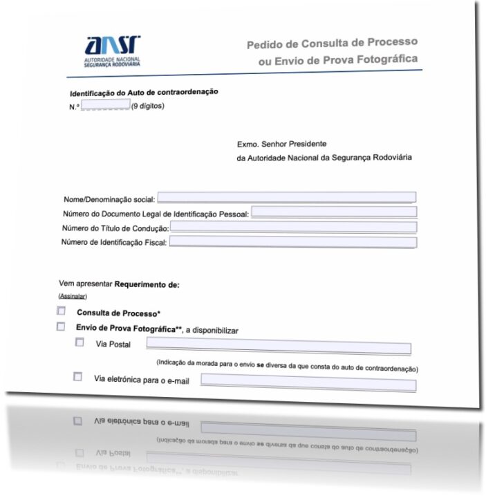 Preencha o requerimento modelo F304. Este formulário, disponibilizado pela Autoridade Nacional de Segurança Rodoviária (ANSR), destina-se à Consulta de Processo / Envio de Prova Fotográfica.