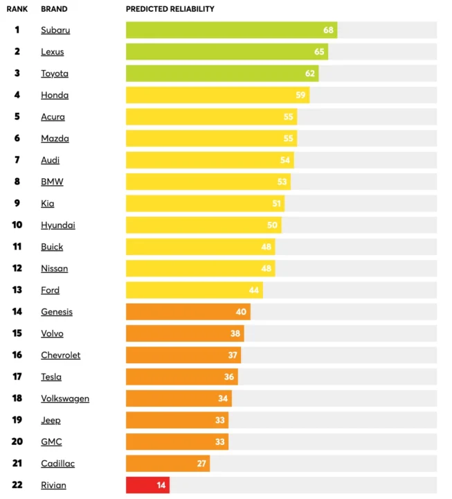 Na base da tabela, os nomes mantêm-se. Marcas americanas como Jeep, GMC e Cadillac voltam a ter resultados dececionantes, bem como a alemã Volkswagen. No fim da lista surge a Rivian, com a pior pontuação do ano.