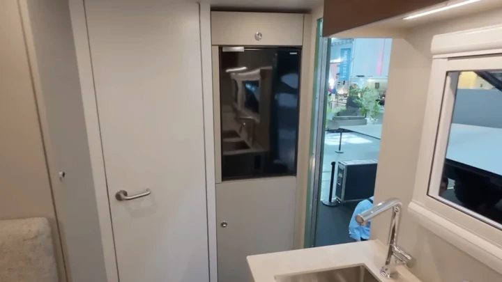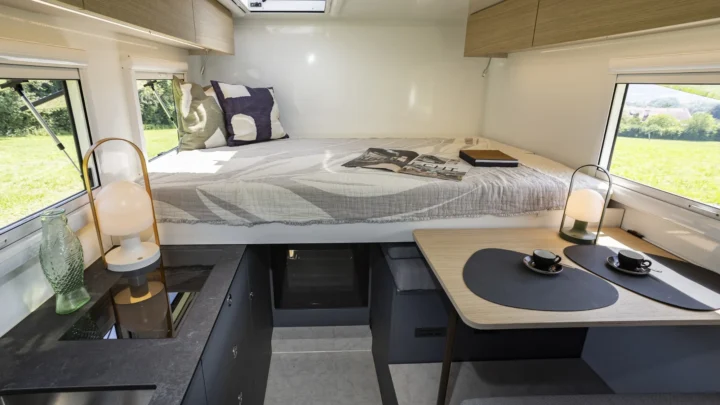 O interior, configurado de fábrica, inclui uma cama dupla, dinete, cozinha equipada e casa de banho húmida.