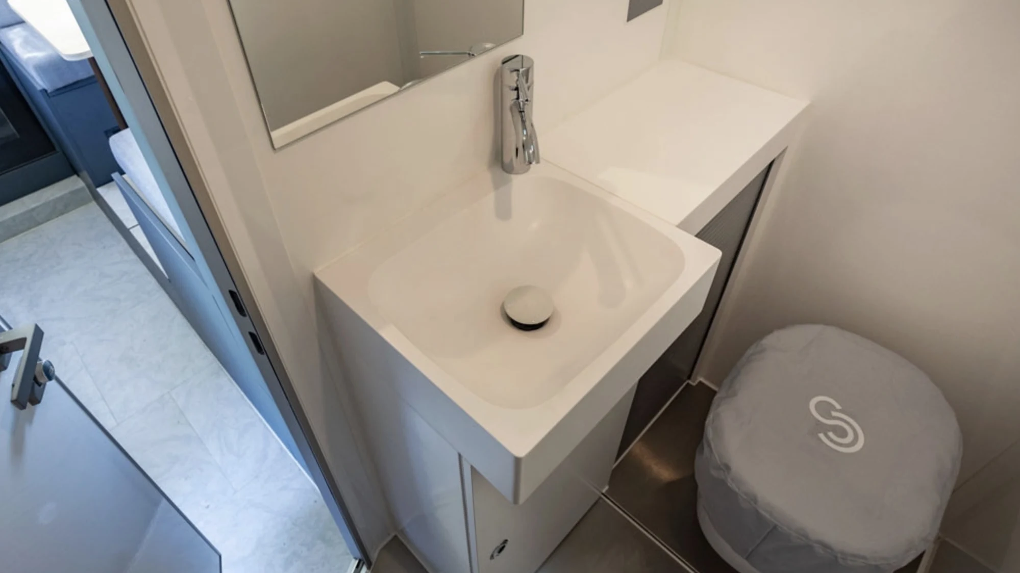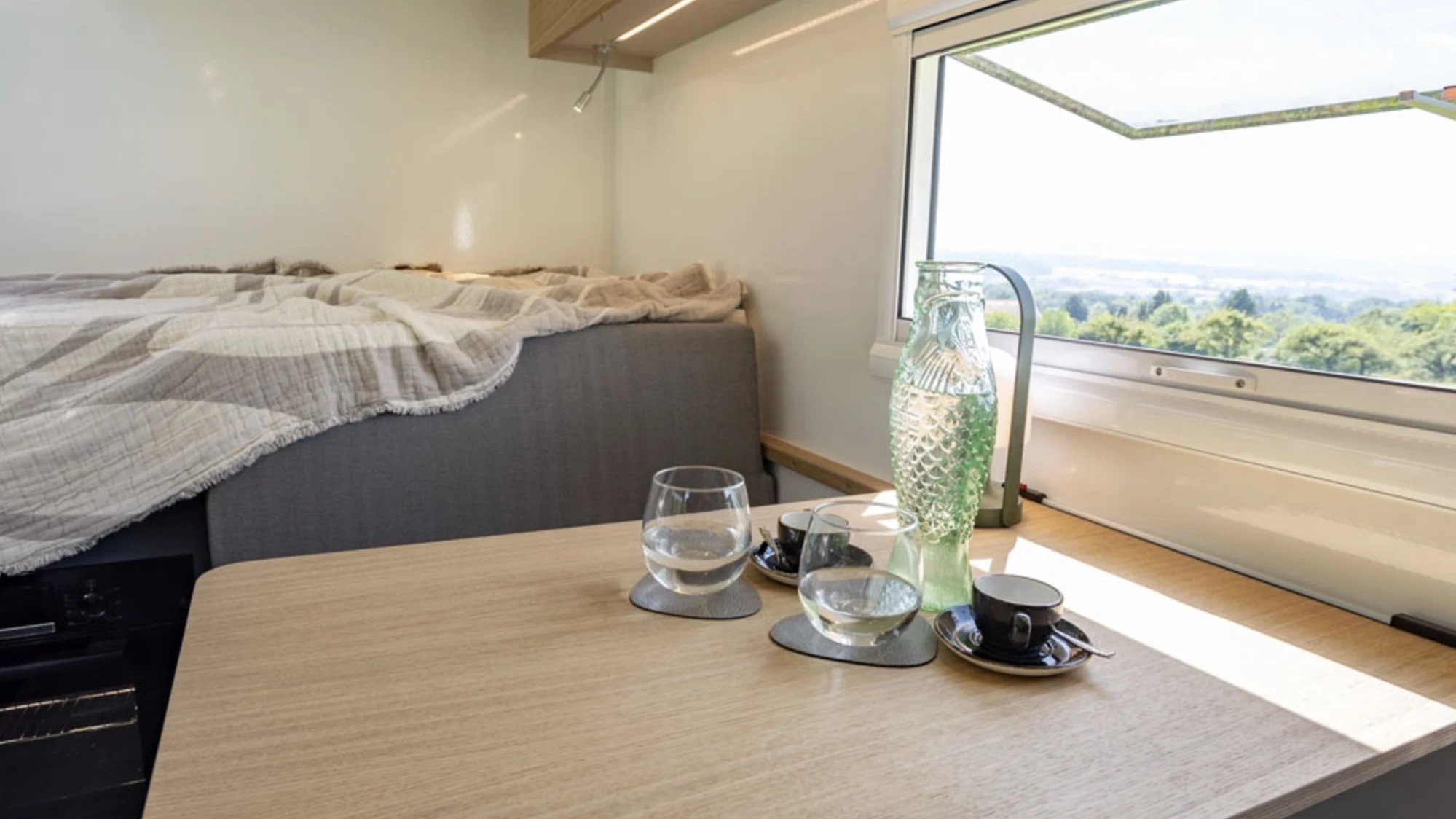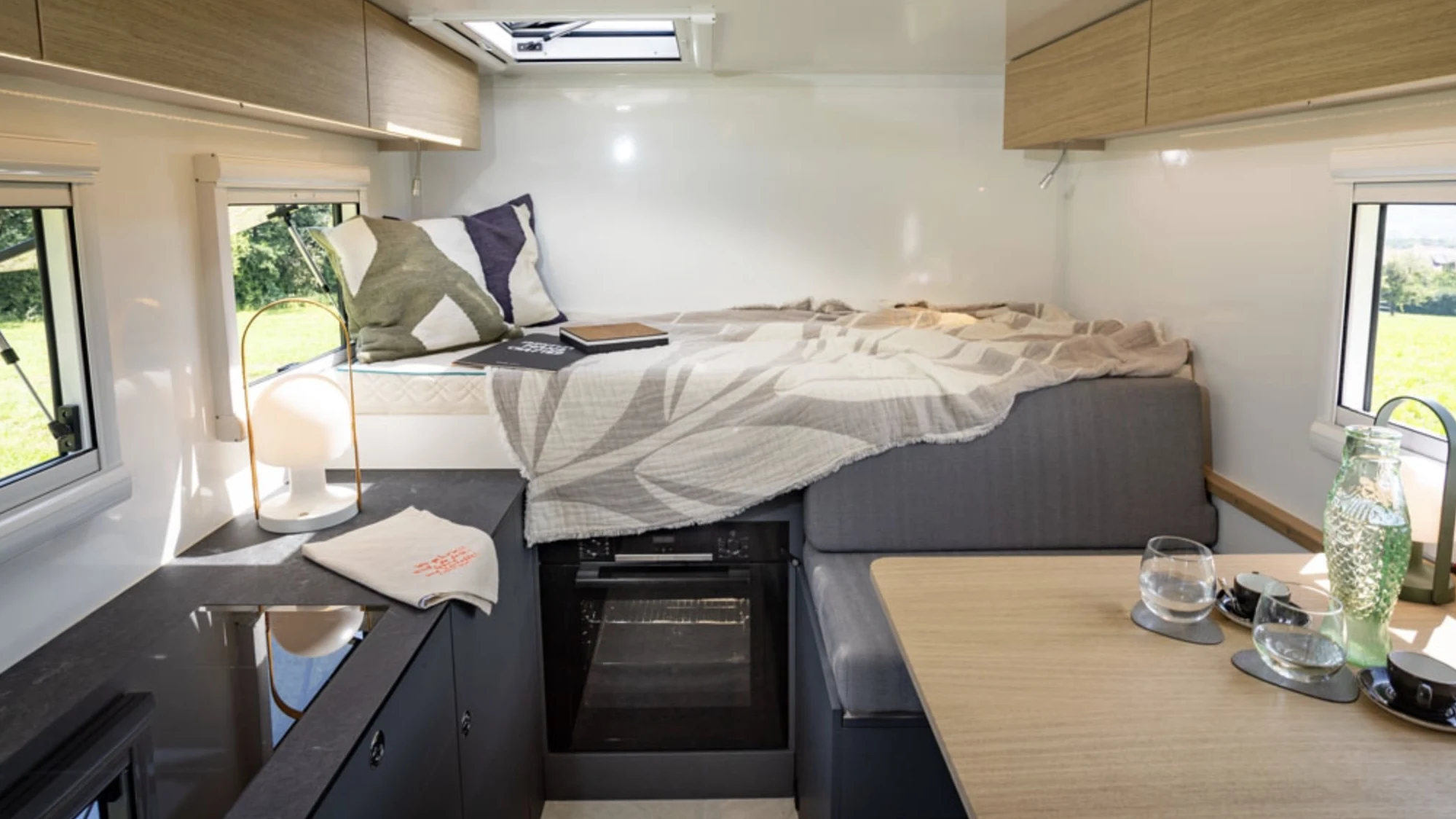 O interior, configurado de fábrica, inclui uma cama dupla, dinete, cozinha equipada e casa de banho húmida.