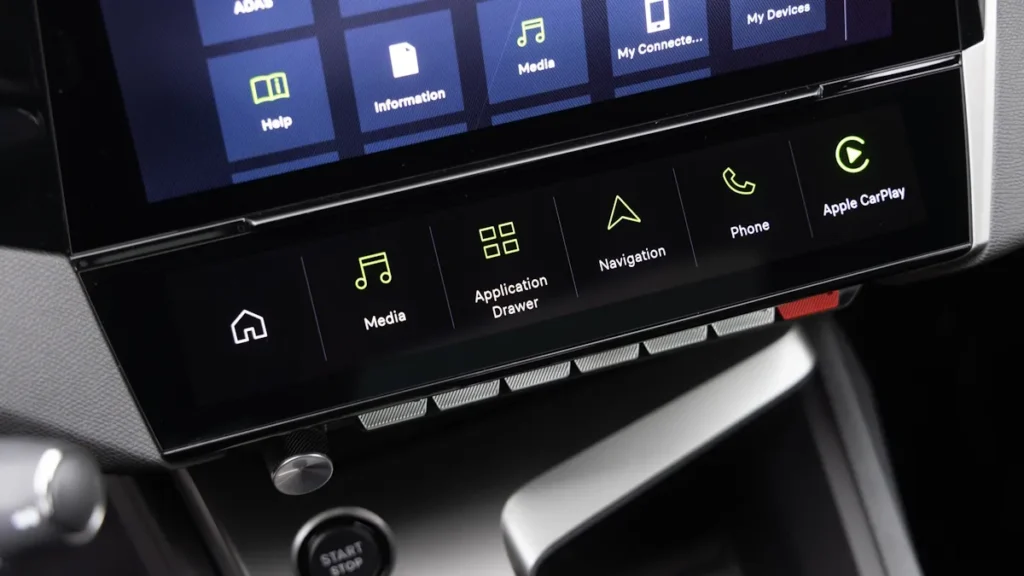 - App MyPeugeot que permite verificar manutenção, localizar o carro, controlar portas, luzes, buzina e até programar carregamentos ou climatização.