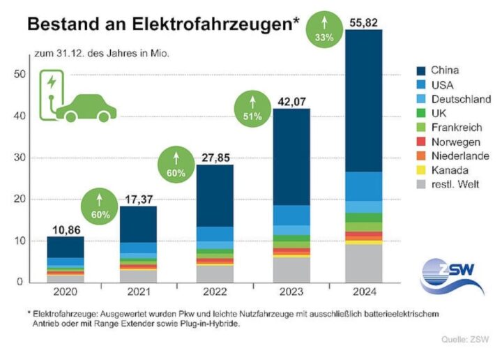 O número total de veículos elétricos em circulação chegou a 55,82 milhões, segundo o último relatório do alemão ZSW, um dos institutos líderes em investigação aplicada, na Alemanha.