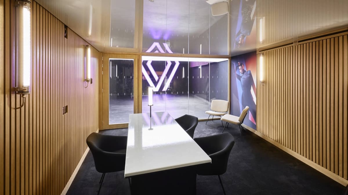 A rampa suspensa revestida a gesso foi feita à mão pela equipa de estucadores, enquanto os painéis de madeira nas paredes lembram o famoso logótipo em forma de diamante da Renault.