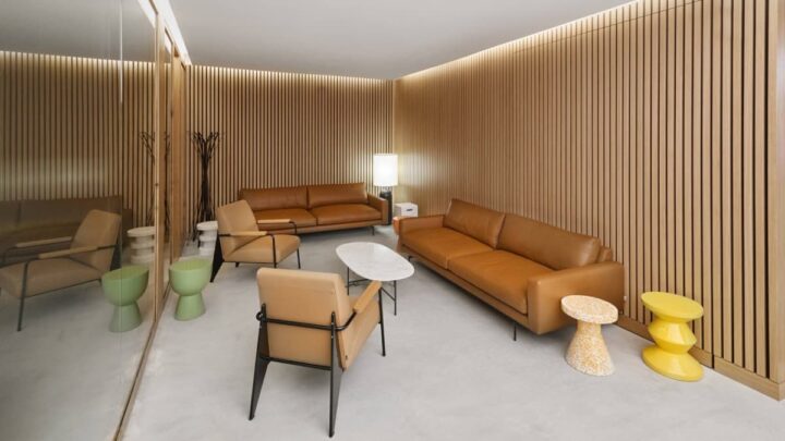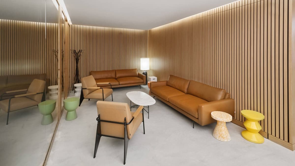A utilização da madeira acrescenta uma agradável sensação de calor, melhorando o conforto acústico e contribuindo para o equilíbrio entre a estética minimalista e um ambiente acolhedor.