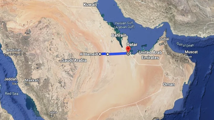 A estrada atravessa o Rub’ al Khali, conhecido como Rub' al-Khālī, em português, Quarto Vazio, o maior deserto de areia do planeta.