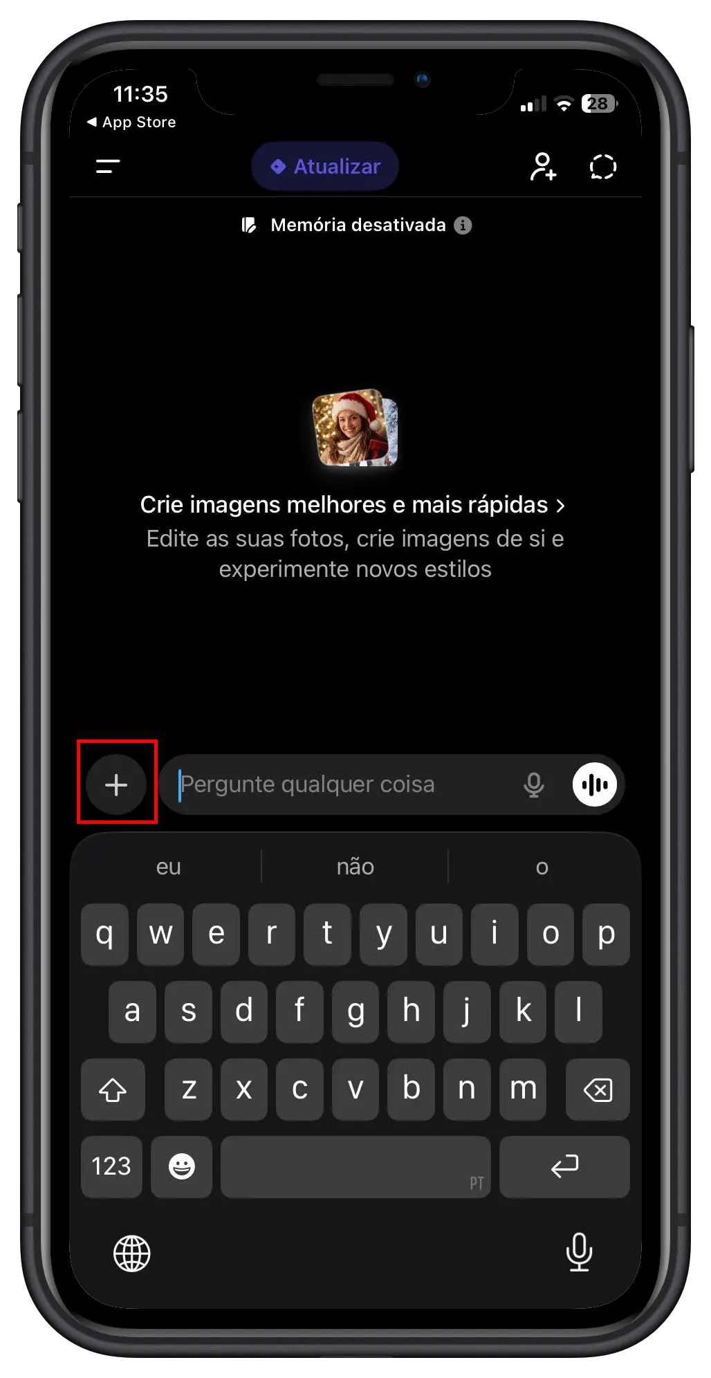 2. Na interface principal, clique no "+" localizado do lado esquerdo da caixa de texto.