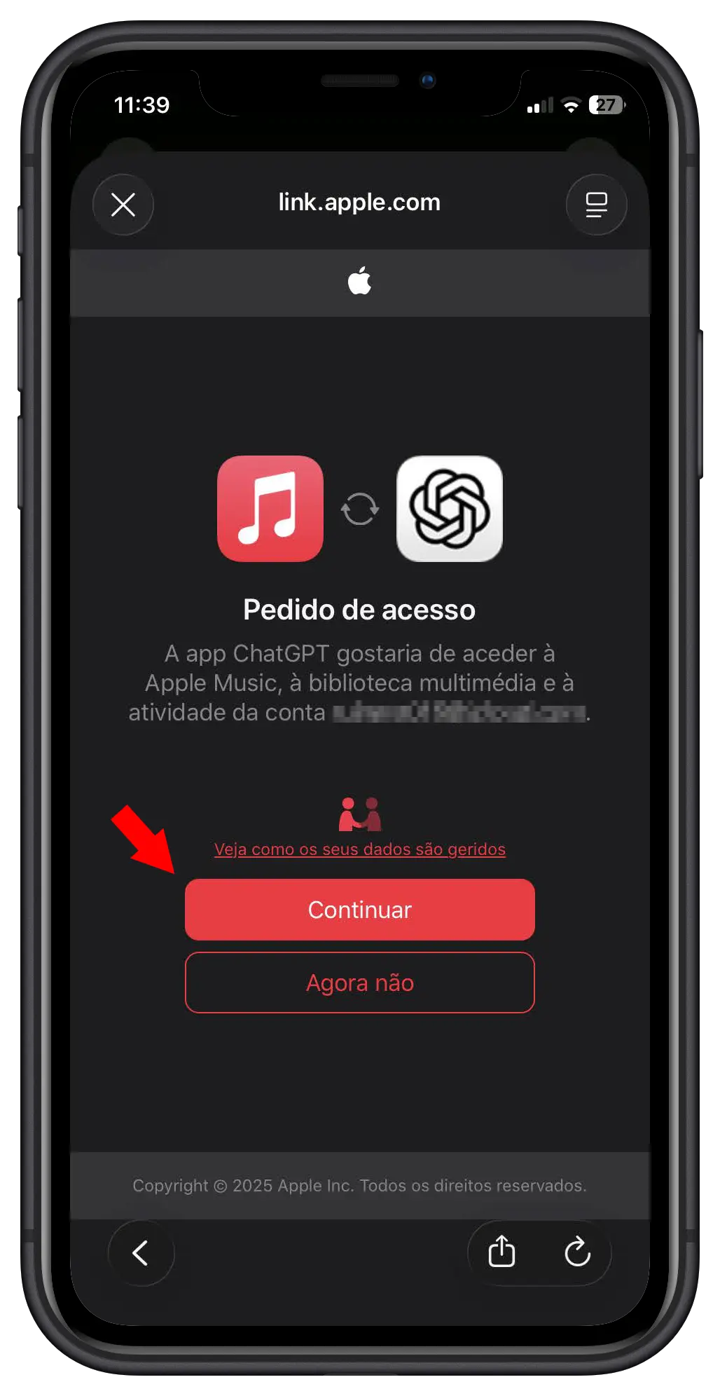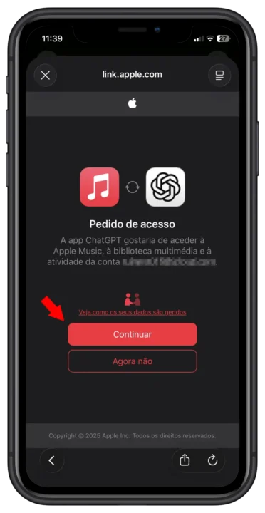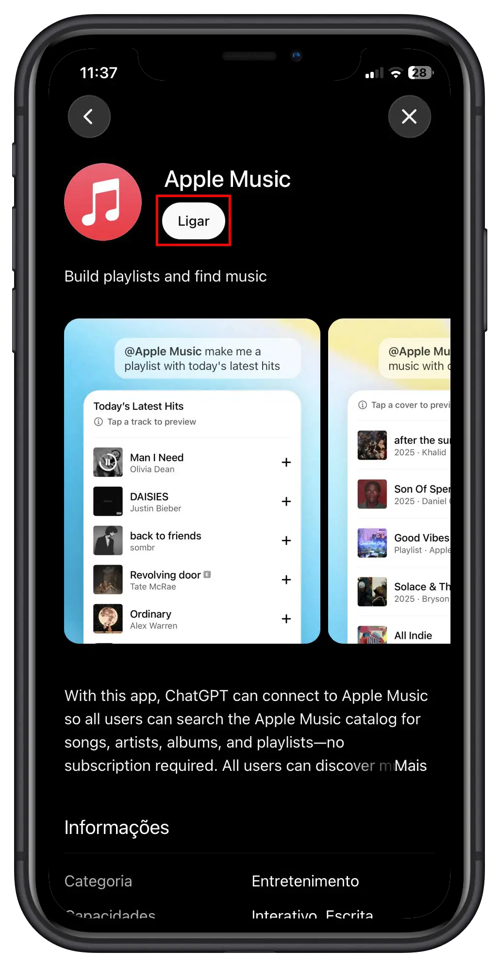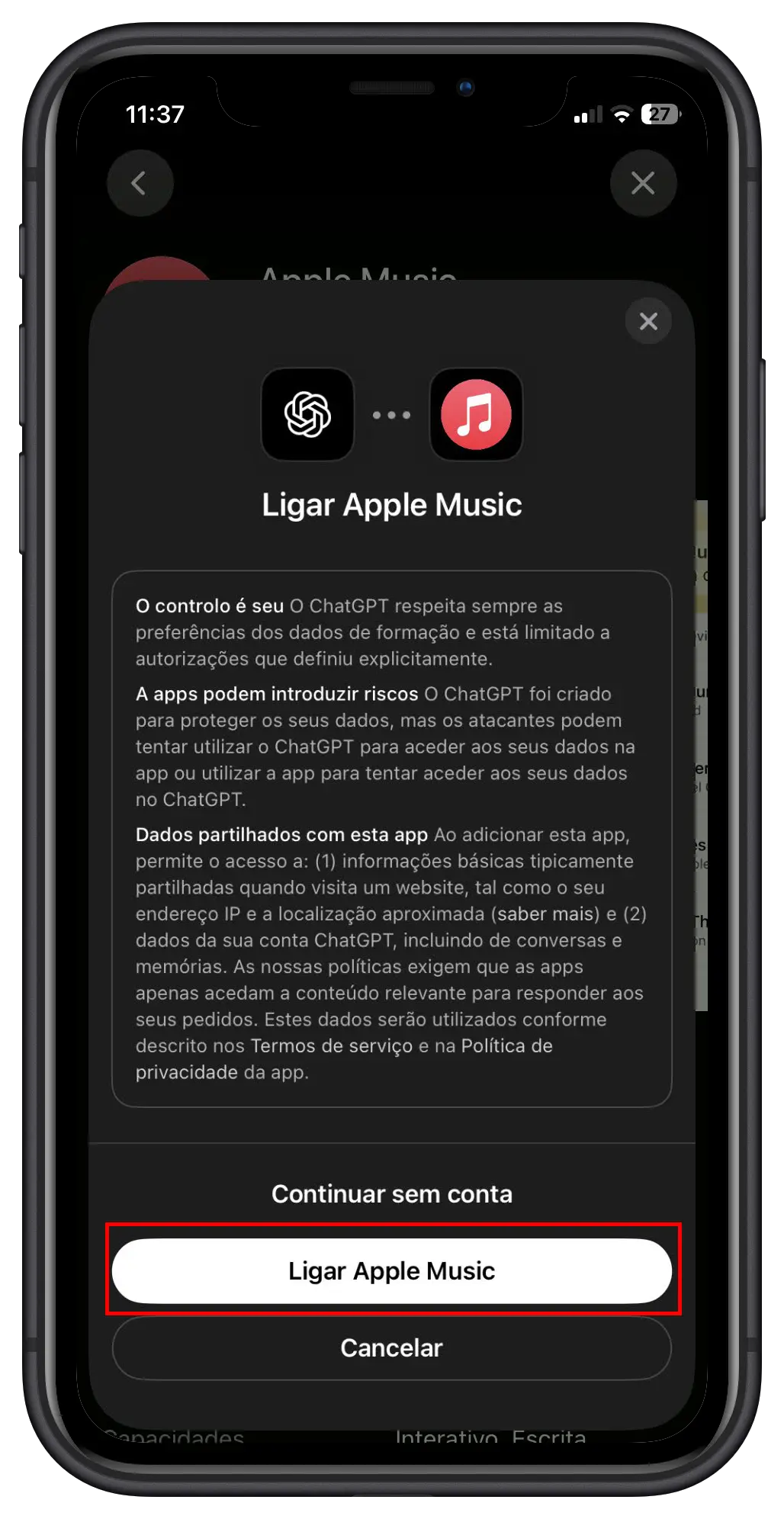 📝 As permissões concedidas são restritas por questões de segurança. O ChatGPT consegue localizar músicas e guardá-las, mas o Apple Music continua a ser o responsável exclusivo pela reprodução, downloads e pelo histórico de audição do utilizador.