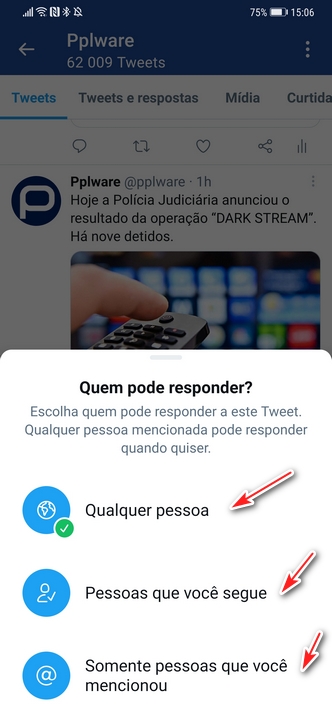 No tweet em questão terá que clicar no menu das definições (reticências vericais) e selecionar a opção “Altere quem pode responder”. Em seguida irão então surgir as opções indicadas anteriormente, basta ajustar e está feito.