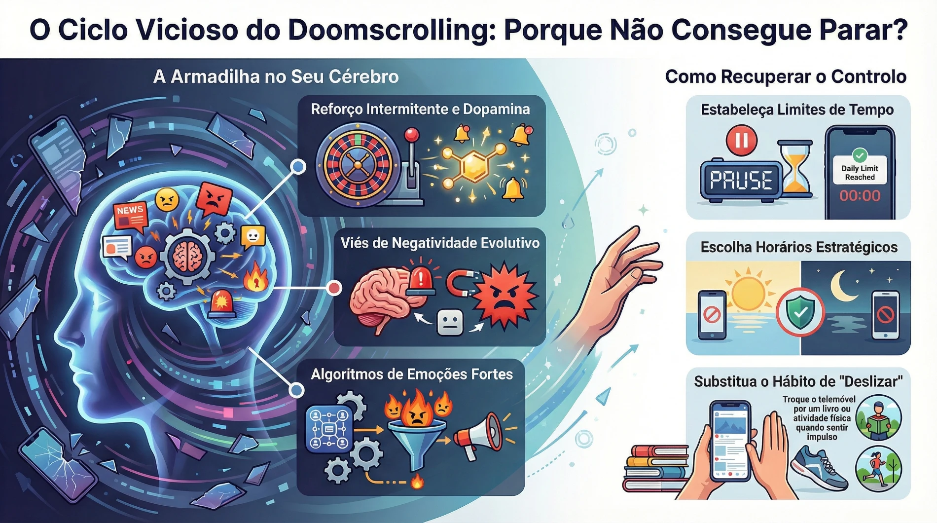 Se se aperceber que passa mais tempo a ler más notícias do que a interagir com a vida real, que se sente mais ansioso depois de se informar, ou que verifica o telemóvel mesmo sem vontade consciente, pode estar preso no ciclo de doomscrolling.