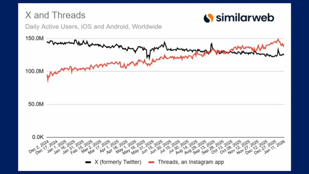 A análise homóloga da Similarweb revela uma trajetória clara: o Threads demonstrou um crescimento acentuado de 37,8% em relação ao ano anterior. Em contrapartida, a audiência móvel diária do X sofreu uma quebra de 11,9% durante o mesmo período, indicando uma inversão de tendências no mercado global.