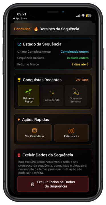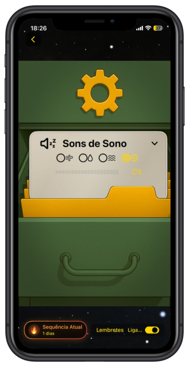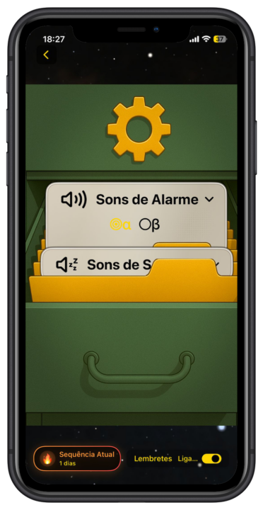 Outros temas vão sendo desbloqueados à medida que utilizamos o alarme e completamos conquistas, através das Sequências, que podem ser acompanhadas, clicando no canto inferior esquerdo do ecrã.