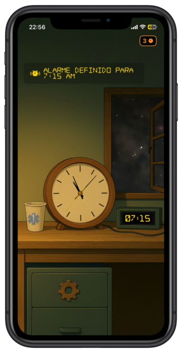 Com um cenário muito simples e intuitivo, a aplicação mostra um relógio analógico e outro digital, sobre uma secretária, posicionada em frente a uma janela, a partir da qual se observa a noite.
