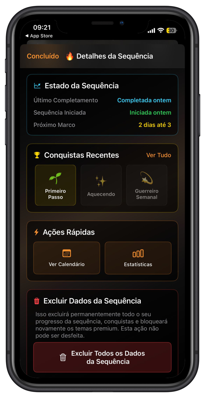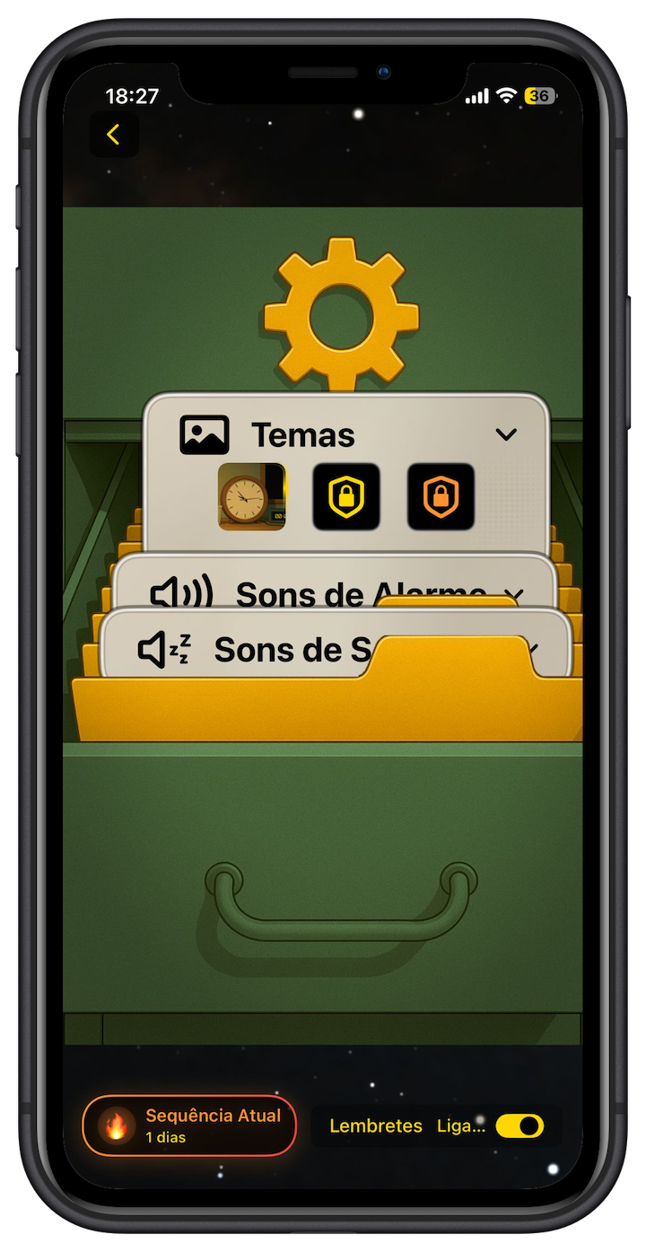 Outros temas vão sendo desbloqueados à medida que utilizamos o alarme e completamos conquistas, através das Sequências, que podem ser acompanhadas, clicando no canto inferior esquerdo do ecrã.