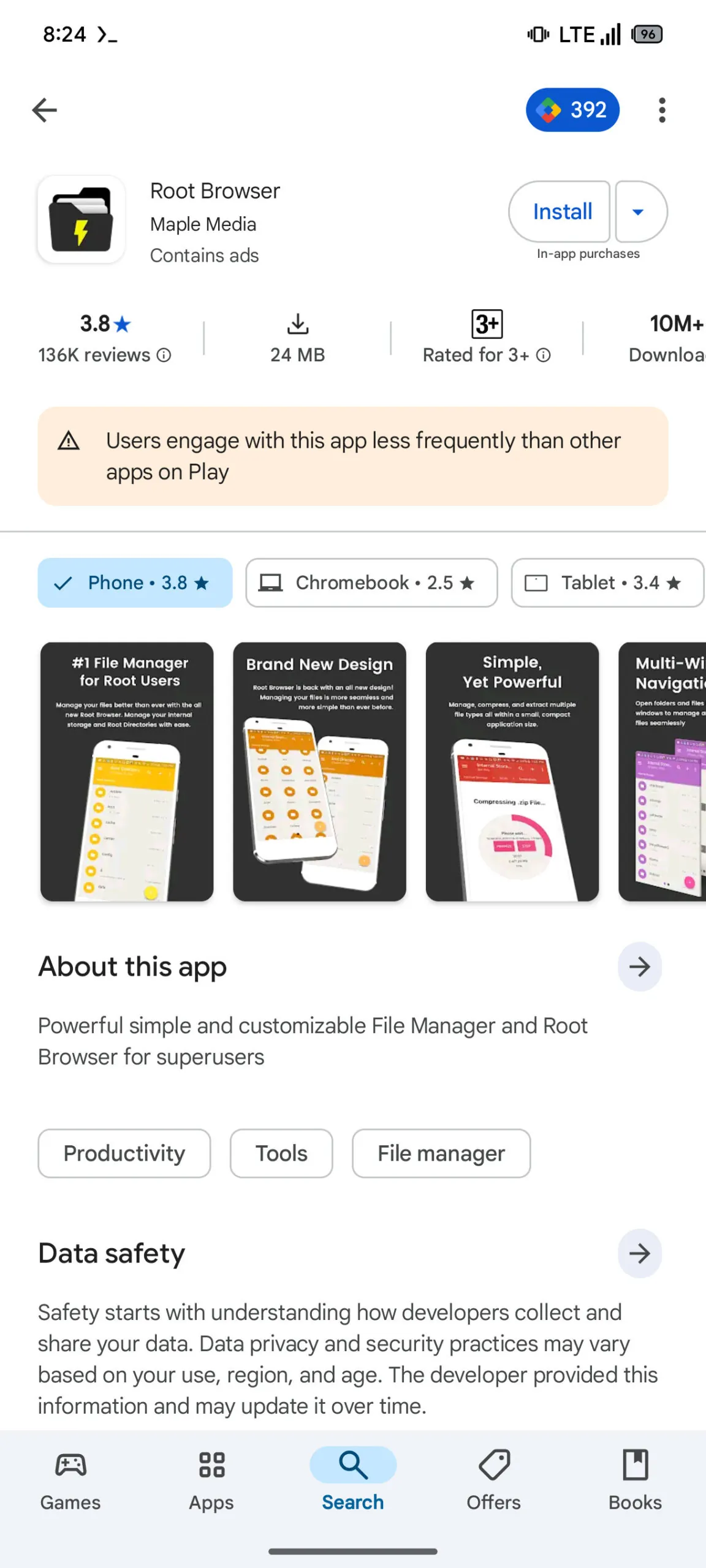 A app Root Browser, por exemplo, pode ser descarregada por muitas pessoas e ser uma boa aplicação no geral. Ainda assim, os utilizadores só a usam para um propósito muito específico, ocasionalmente devido ao seu foco no acesso de root. Portanto, as pessoas interagem com ele com menos frequência do que com outras apps de navegação de ficheiros disponíveis.