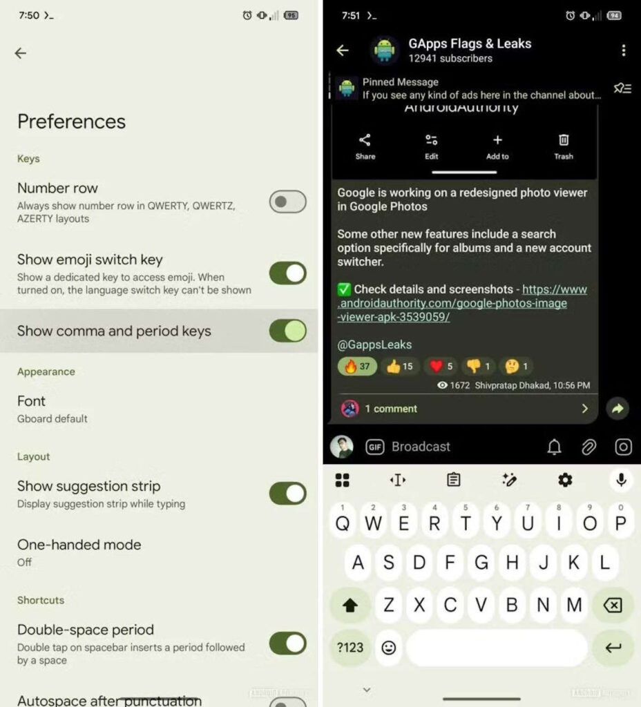 No entanto, ao contrário da implementação da Apple, os utilizadores terão provavelmente a opção de utilizar o novo layout ou manter o antigo. A mudança foram vistas na versão 15.2.03.736047990-beta-arm64-v8a do Gboard para Android. Aqui destaca-se uma nova opção nas definições dedicada a "mostrar teclas de vírgula e ponto".