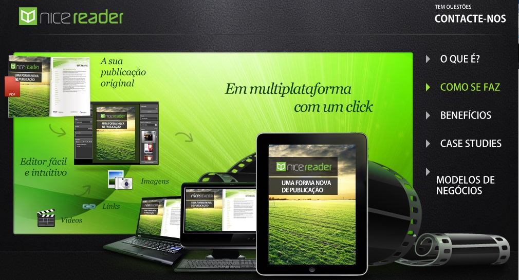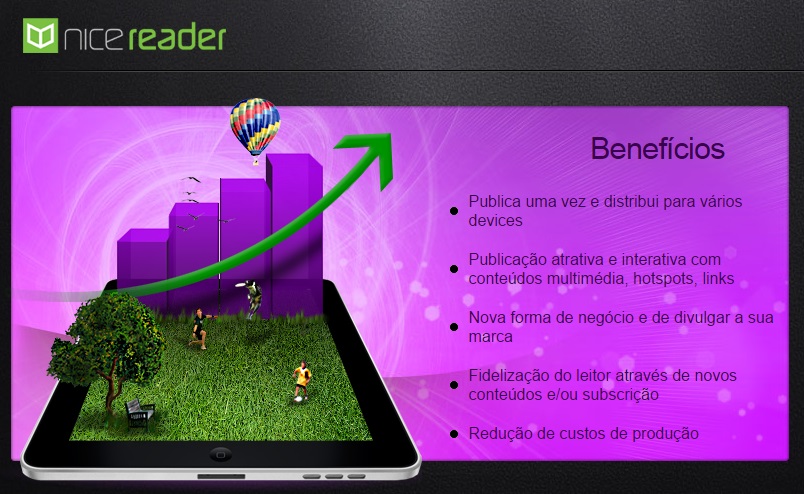 NiceReader é uma forma de distribuição de publicações em multiplataformas - ipad, web e android, e uma forma de surpreender os leitores - enriquecendo as publicações com Vídeos, Som, Slide Shows, Links, Hotspots, Scroll. Permite ainda partilhar conteúdo nas redes sociais e criar tráfego para a sua marca.