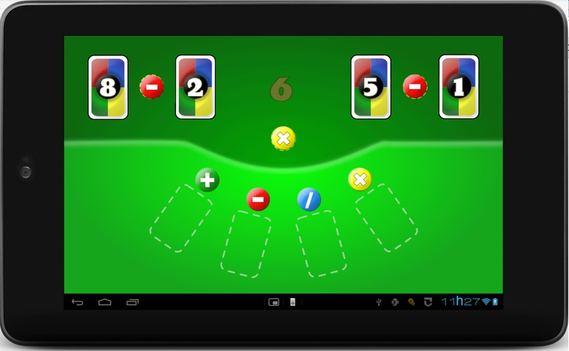 Para jogar, o jogador receberá 4 cartas com valores de 1 a 9 e as fichas com operações aritméticas. Deve escolher a posição correta para as cartas e a operação adequada por forma o resultado final ser de 24