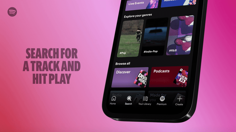 Para ouvir uma música, basta procurá-la, mas também se pode ouvir através de um link partilhado por um amigo ou pelo próprio artista. Também pode ser simplesmente selecionando-a numa playlist ou na página inicial da aplicação. Esta é uma grande mudança por parte do Spotify e do que oferece a todos os utilizaodres.