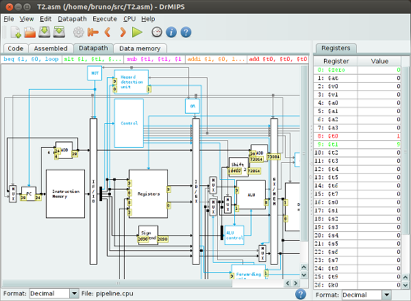 Simula a execução de um programa MIPS passo a passo e mostra o código máquina resultante e estado do processador: registos, memória de dados e uma representação gráfica do caminho de dados do processador (versões uniciclo e pipeline). É também bastante configurável.