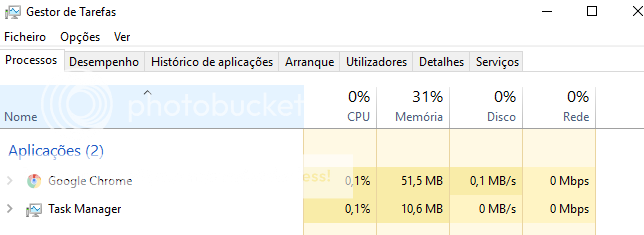 Tiago santks nao te esqueças de clicar em mais detalhes e ir à pesca da dezena de processos que o chrome cria… O que vez no gestor de tarefas dentro da parte dos programas abertos é apenas a ponta do iceberg… Clica la em mais detalhes e vai pesquisar os outros 8 ou 9 processos que estao abertos em background… Pelo menos uns 3 ou 4 estao a gastar mais de 50mb de ram no minimo…